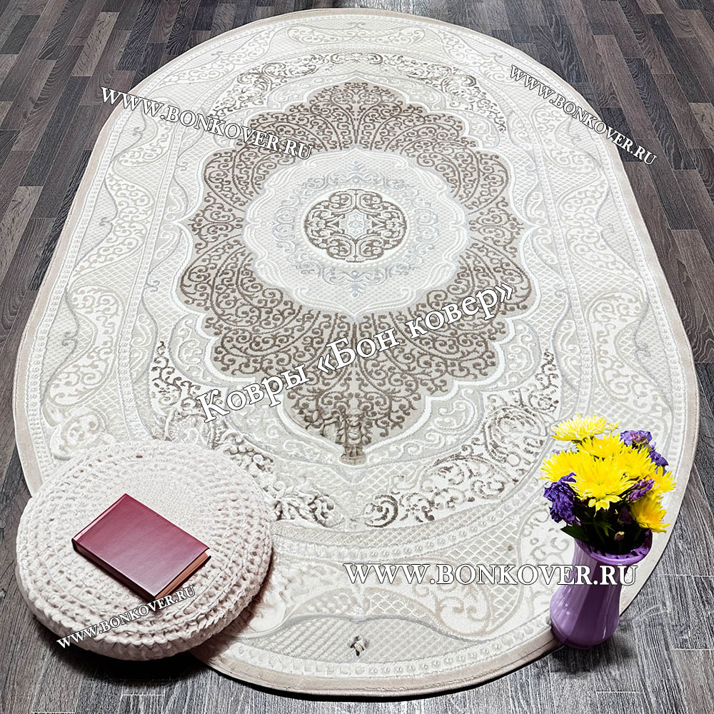Элегантный Ковер в гостиную дизайн 02 Белый Овал наполняет интерьер квартиры теплом и уютом, гармонично сочетает в себе изящество и стиль. Он выполнен из высококачественного сырья, комфортный и долговечный.