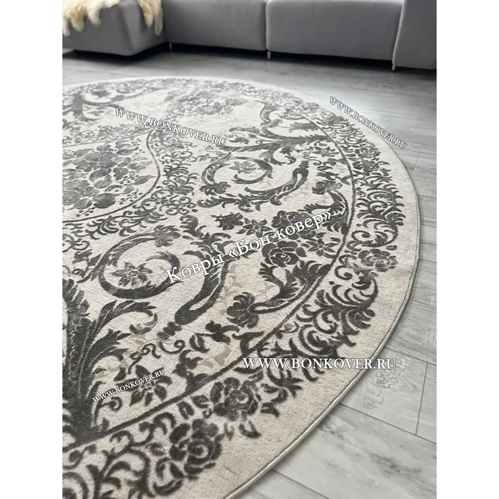 Элегантный Круглый Ковер Для Гостиной Дизайн 29948 Белый с Серым наполняет интерьер квартиры теплом и уютом, гармонично сочетает в себе изящество и красоту. Он создан из высококачественных материалов, комфортный и долговечный.